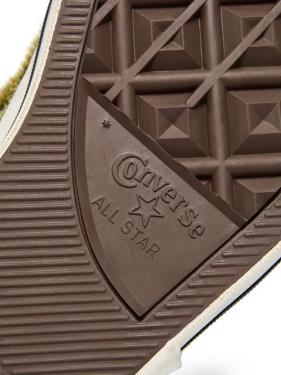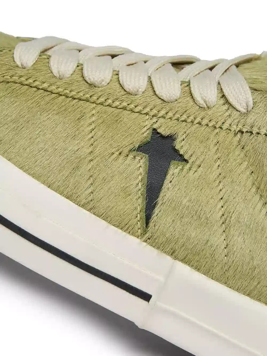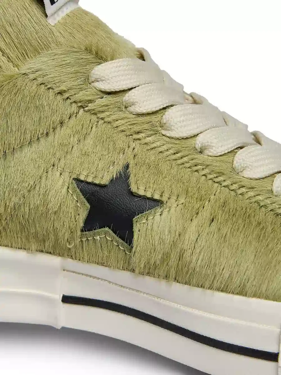 HET HEEFT EEN BOVENWERK VAN HAAR OP KOEIENLEER EN EEN KENMERKENDE DRKSHDW VERLENGDE TONG MET EEN GEWIKKELD LABEL MET DE MODELNAAM EN EEN KLASSIEKE CONVERSE SKATEBOARD ONE STAR CONVERSE ZOOL, GEVULD DOOR EEN KENMERKENDE RICK OWENS SNEAKS GEVORMDE RUBBEREN HAK.