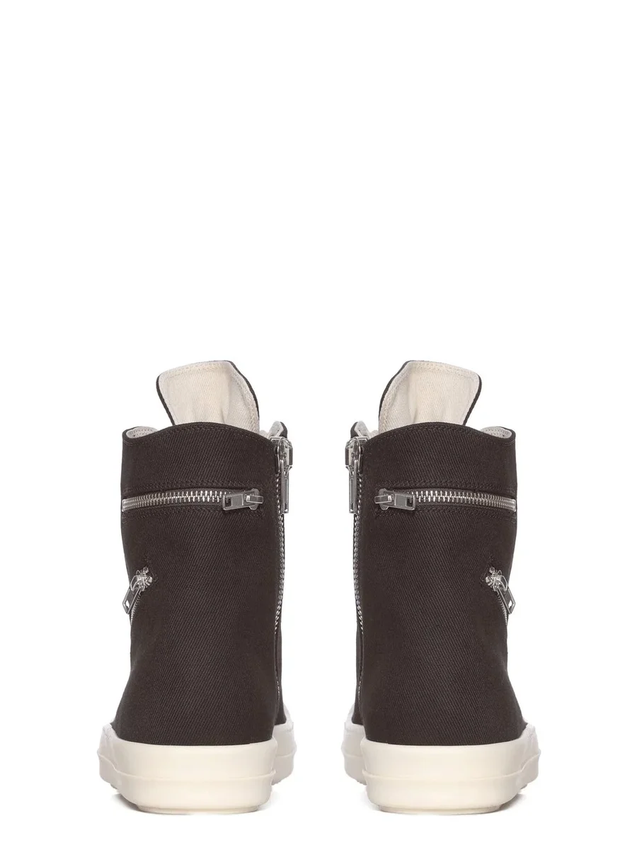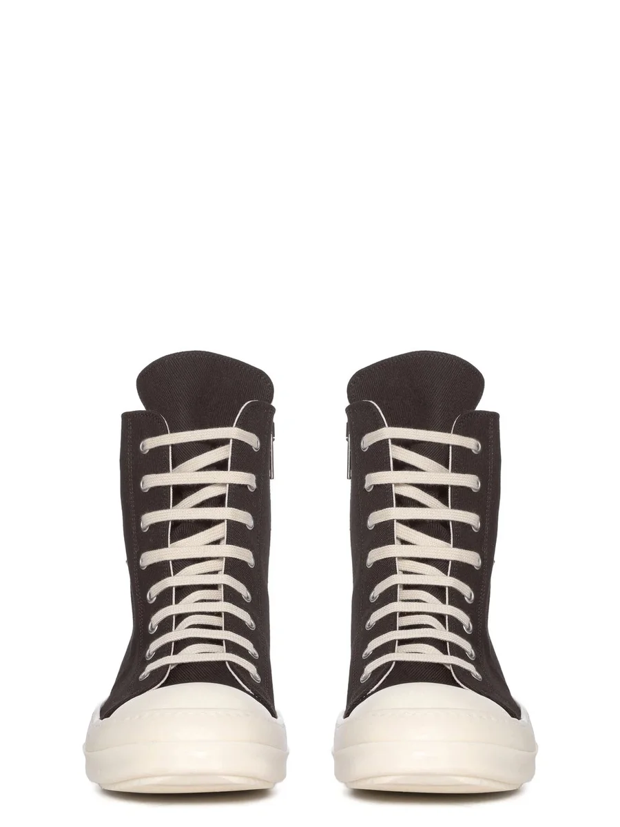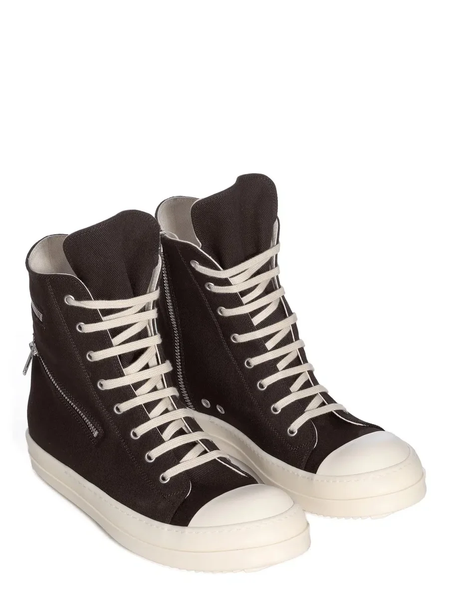 DEZE CARGO SNEAKS ZIJN HOOG TOT DE ENKEL EN HEBBEN ACHT OOGELTJES, VETERS, EEN RITS AAN DE BINNENKANT VAN DE ENKEL VOOR EENVOUDIG AANTREKKEN, NEUSKAPPEN EN EEN SCHAATFOUT MET HAAIENGATTEN. DEZE VERSIE HEEFT EEN SCHUINE CARGO-RITS AAN DE BUITENKANT VAN DE VOET EN EEN HORIZONTALE RITS ROND DE ENKEL.