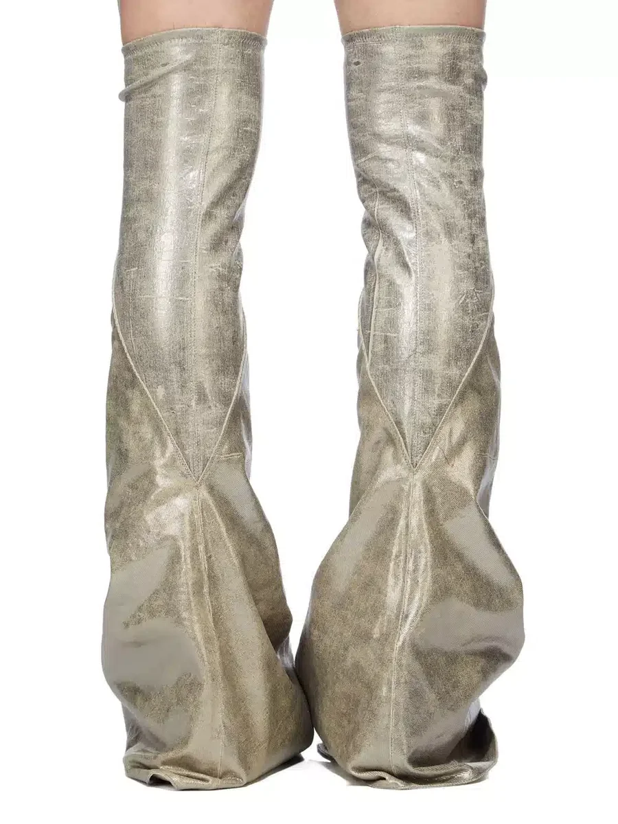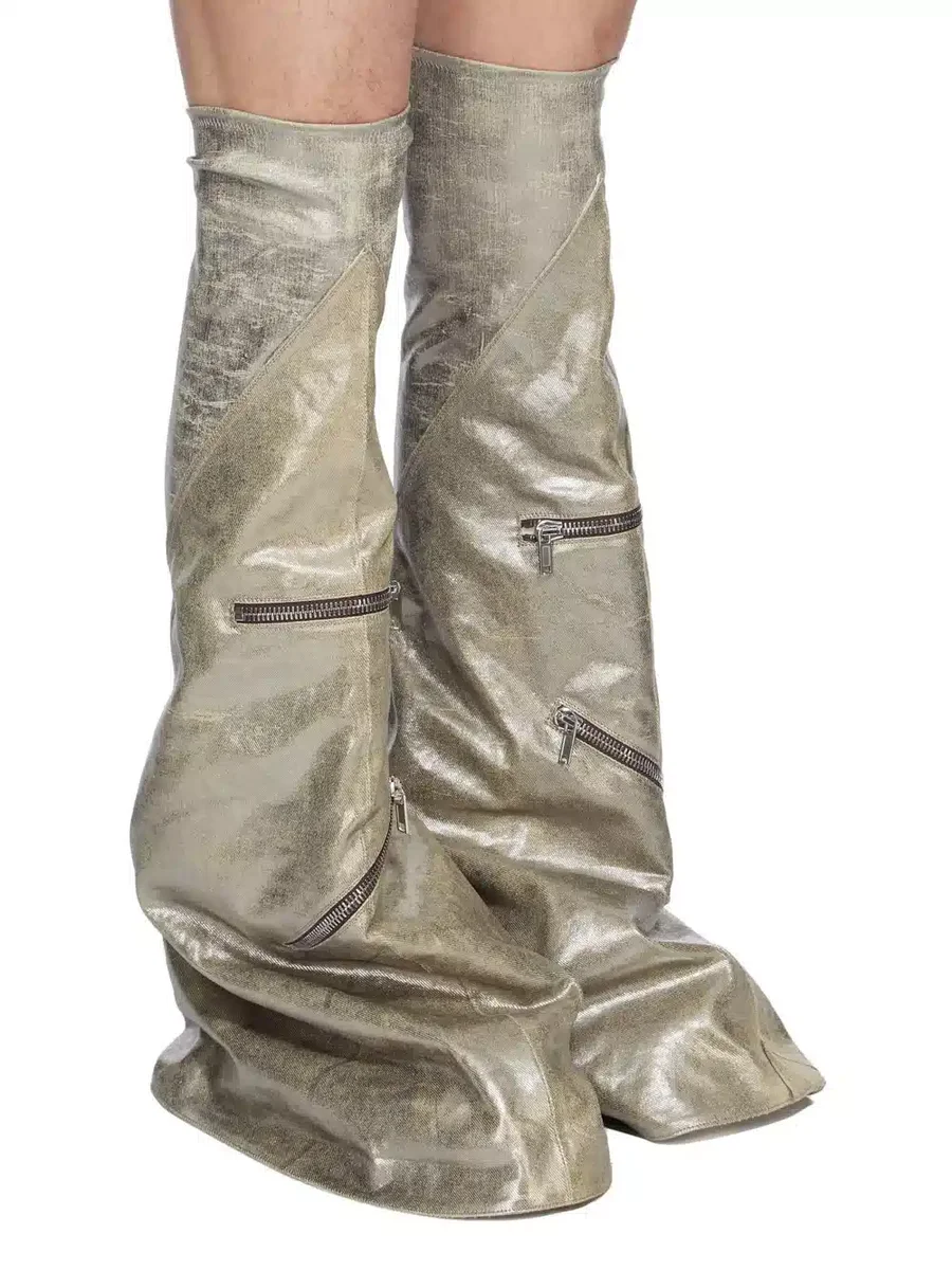 DEZE CARGO FETISH LAARZEN ZIJN BOVEN DE KNIEHOOG EN HEBBEN EEN BOVENKANT VAN STRETCHLEER. ZE HEBBEN EEN BOVENKANT IN DE VORM VAN EEN LAARZEN MET EEN EXTRA LAAG DIE VAN EEN ASYMMETRISCHE NAADLIJN VALT EN DE VLOER SCHAAIT. ZE HEBBEN TWEE RITSEN AAN DE VOORKANT, EEN HORIZONTALE EN EEN SCHUINE. ZE HEBBEN MELKNEEUWSKAPPEN EN ZOLEN MET HAAIENTANDEN.