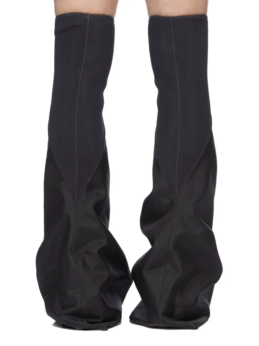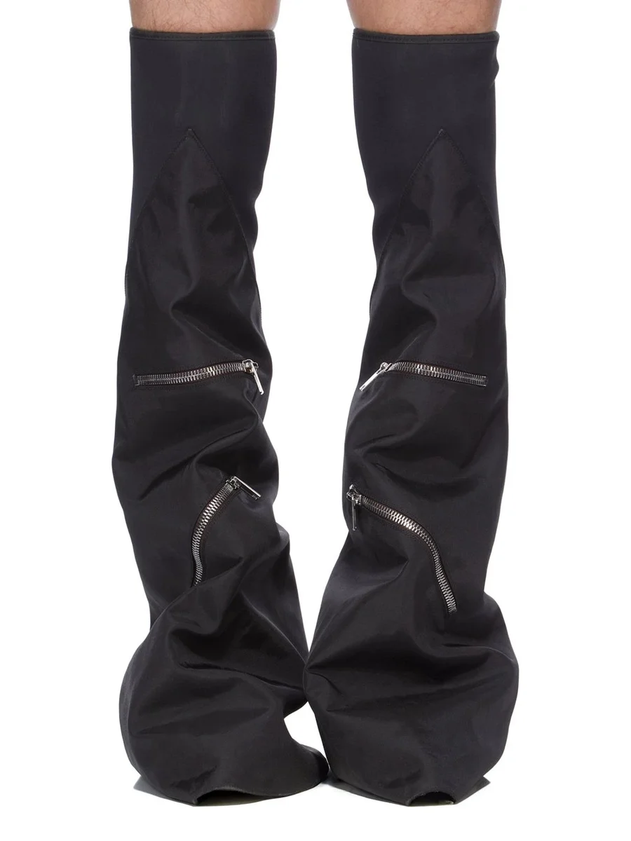 DEZE CARGO FETISH LAARZEN ZIJN BOVEN DE KNIEHOOG EN HEBBEN EEN BOVENKANT VAN STRETCHLEER. ZE HEBBEN EEN BOVENKANT IN DE VORM VAN EEN LAARZEN MET EEN EXTRA LAAG DIE VAN EEN ASYMMETRISCHE NAADLIJN VALT EN DE VLOER SCHAAIT. ZE HEBBEN TWEE RITSEN AAN DE VOORKANT, EEN HORIZONTALE EN EEN SCHUINE. ZE HEBBEN MELKNEUSJES EN ZOLEN MET HAAIENTANDEN.