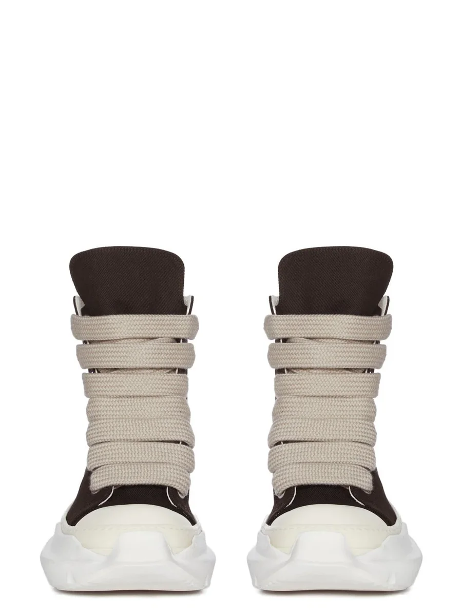 DEZE JUMBOLACE ABSTRACT SNEAKS ZIJN HOOG EN HEBBEN ZEVEN GROTE OOGGEEL, JUMBO VETERS, NEUSKAPPEN EN EEN VOLUMINEUZE RUBBEREN ABSTRACTE ZOOL.