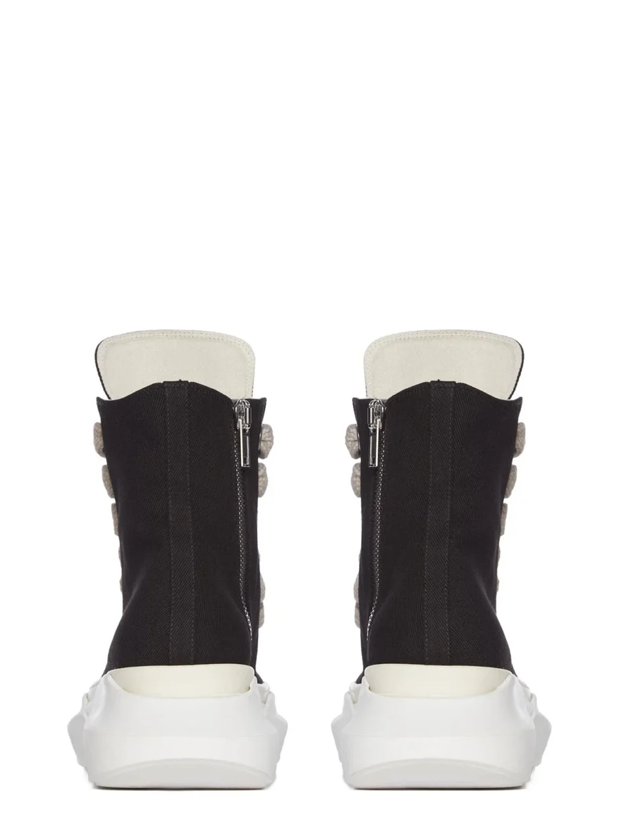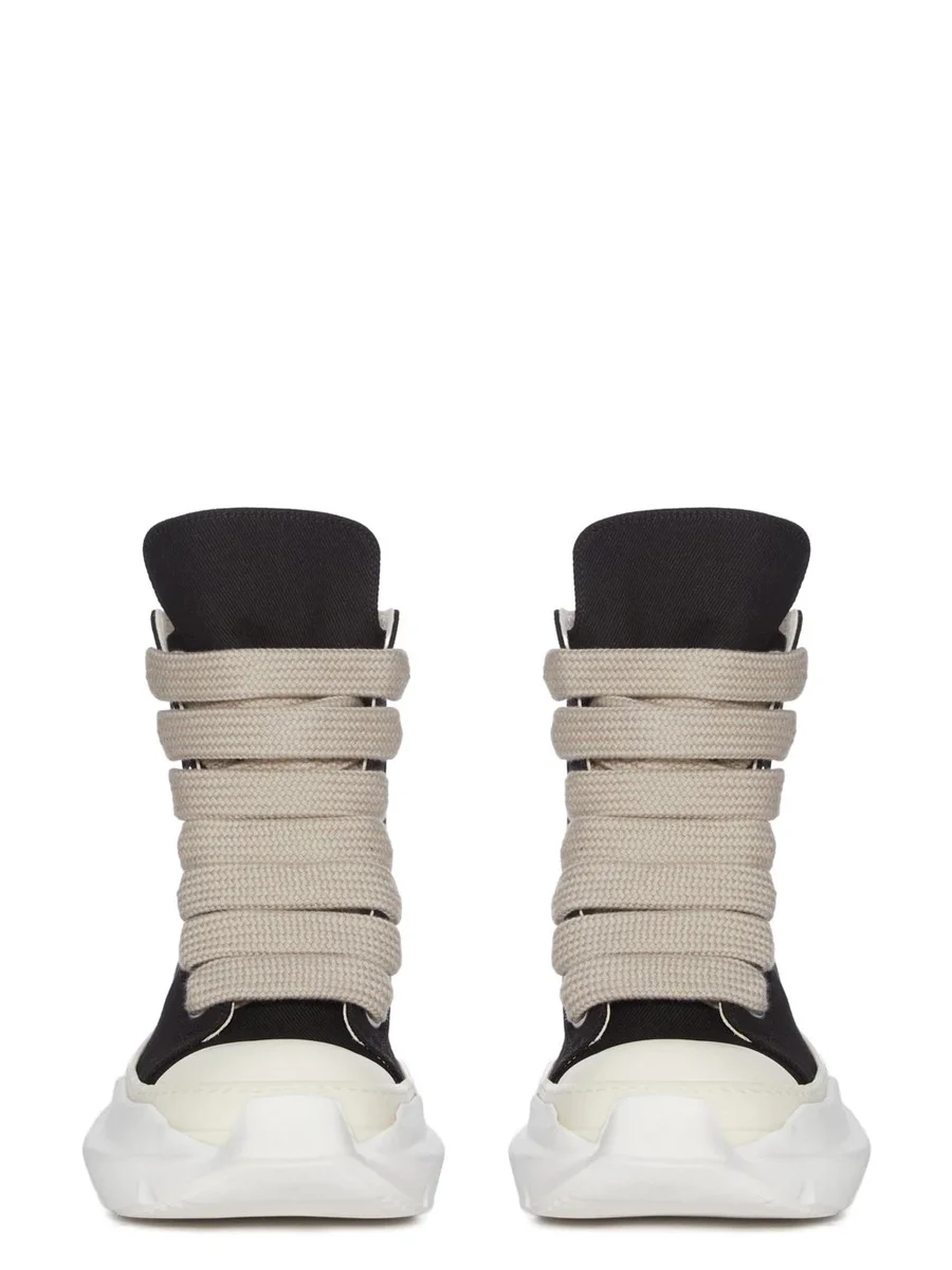 DEZE JUMBOLACE ABSTRACT SNEAKS ZIJN HOOG EN HEBBEN ZEVEN GROTE OOGGEEL, JUMBO VETERS, NEUSKAPPEN EN EEN VOLUMINEUZE RUBBEREN ABSTRACTE ZOOL.