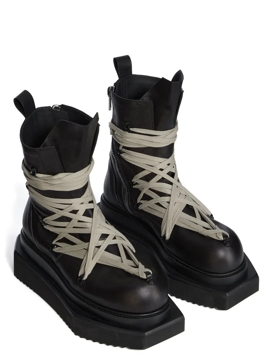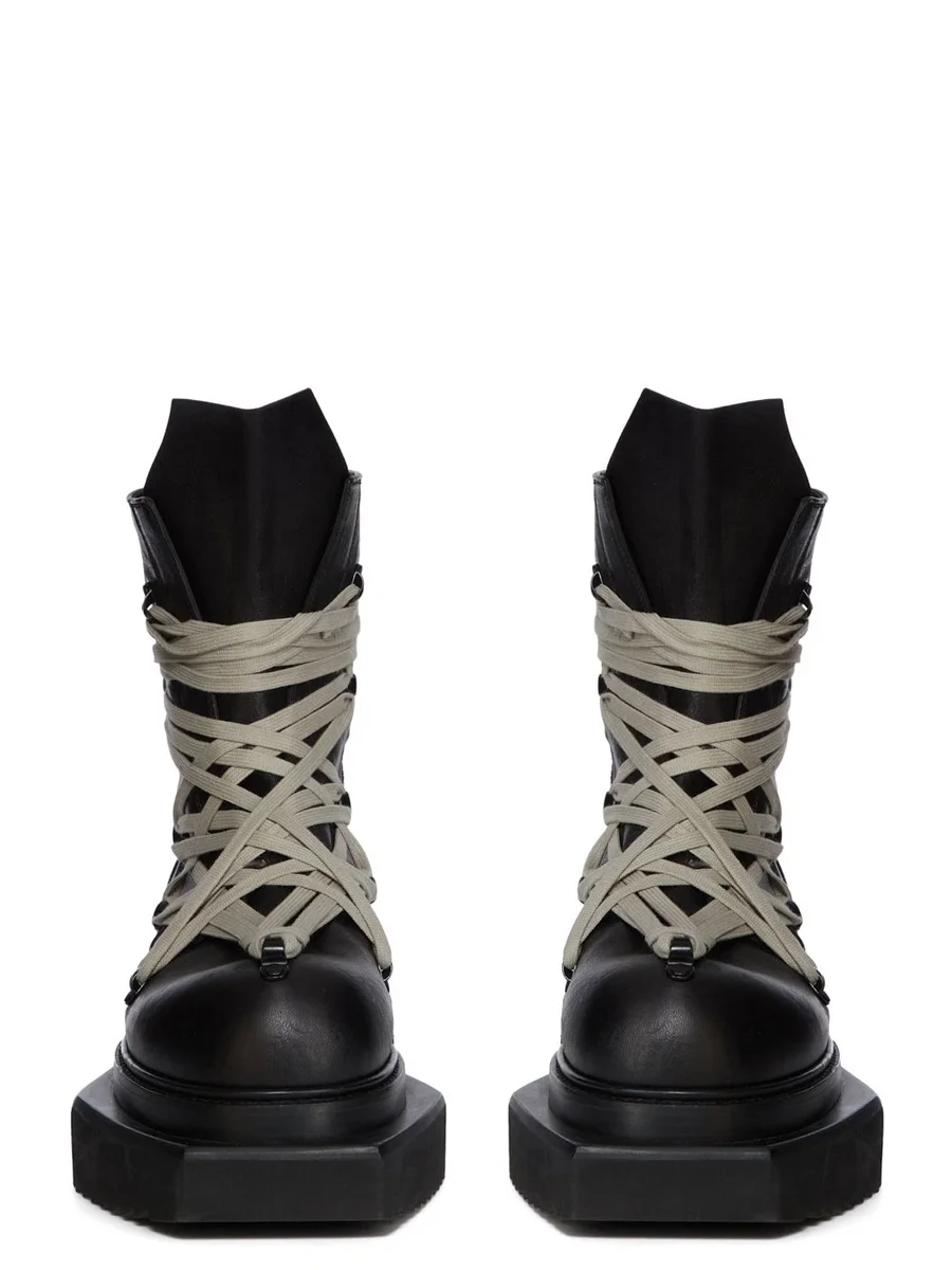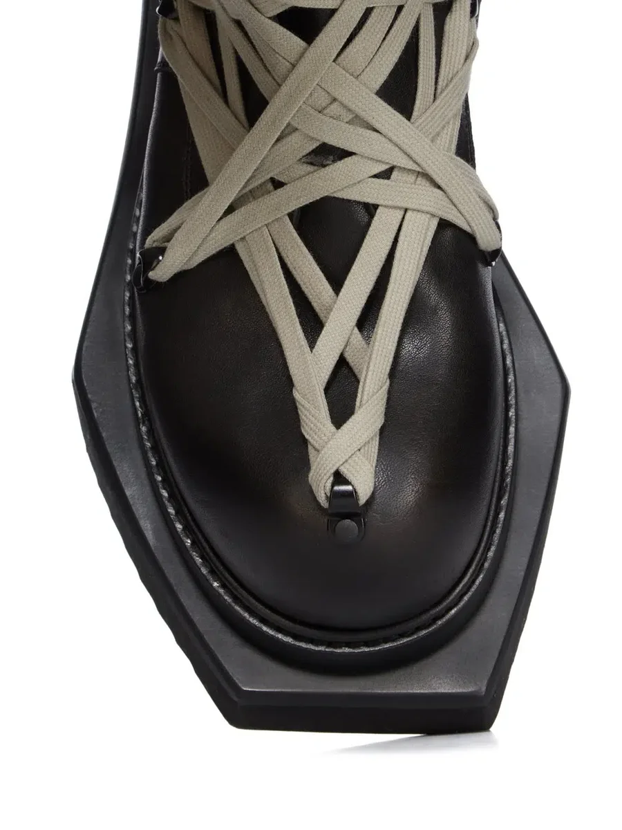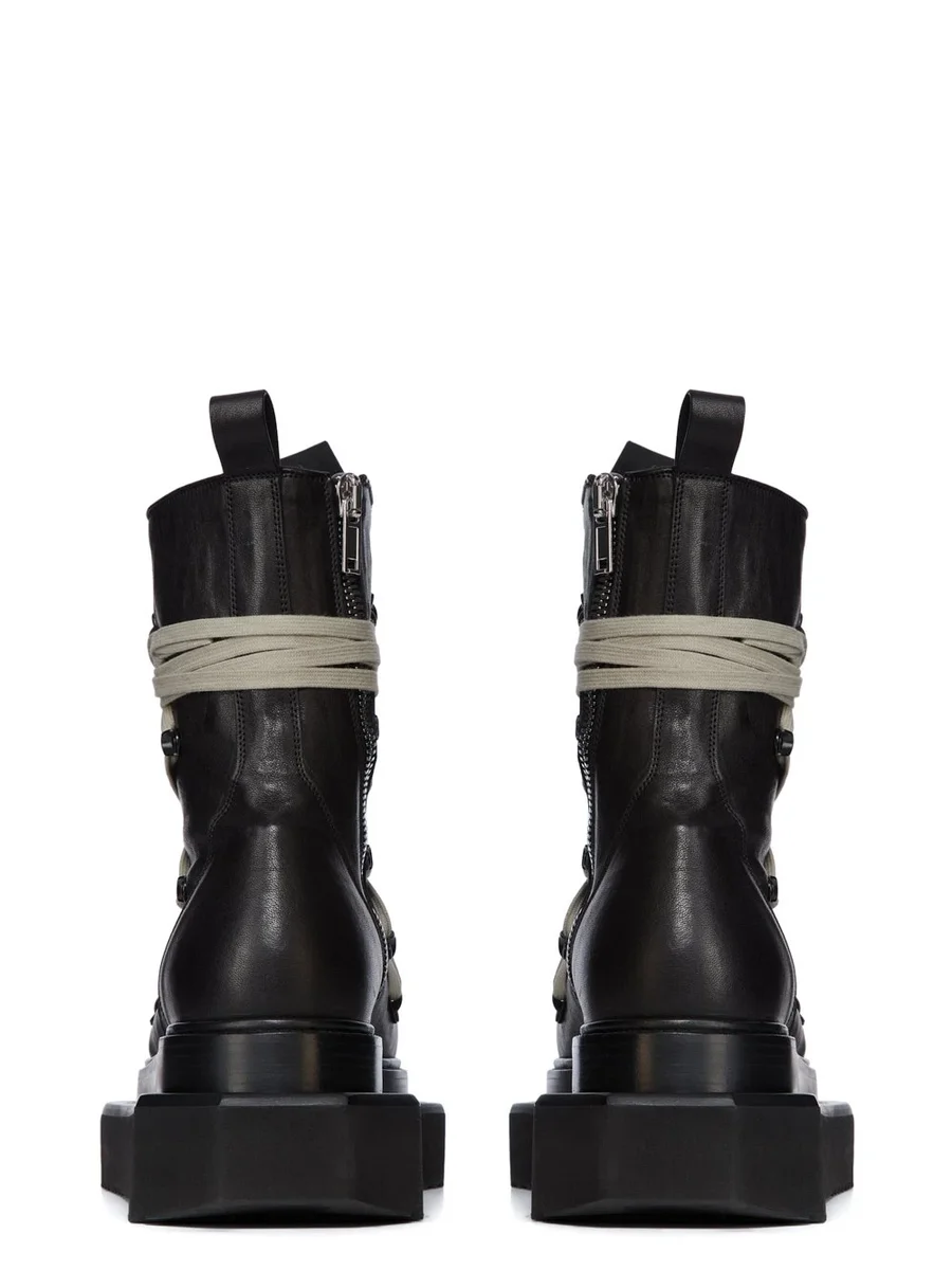 DEZE MEGALACE® TURBO CYCLOPS LAARZEN ZIJN HALFHOOG. ZE HEBBEN SCHUINE DOORGENAAIDE PANELEN EN EEN RITSSLUITING OP DE BUITENBEEN VOOR EENVOUDIG SLUITEN EN EEN TREKLIPJE AAN DE ACHTERKANT. ZE HEBBEN EEN PENTALACING EN EEN HOOGGEOMETRISCHE TONG EN EEN RUBBEREN CYCLOPS MEGA CREPER ZOOL.