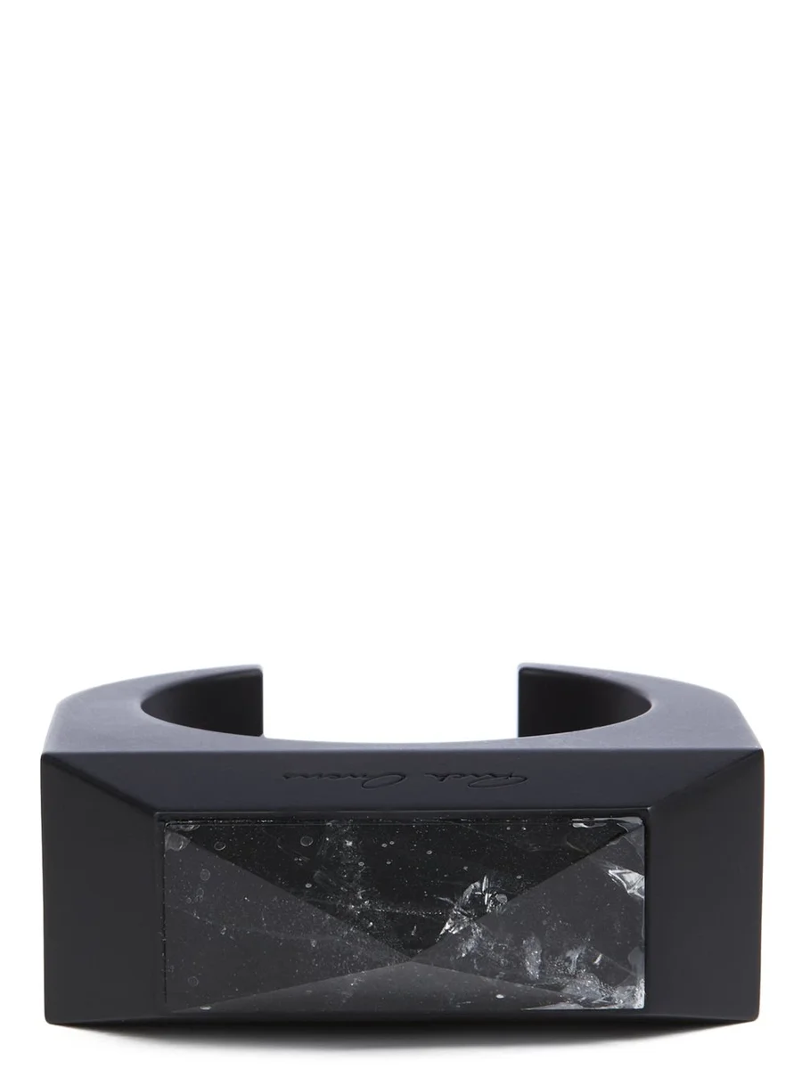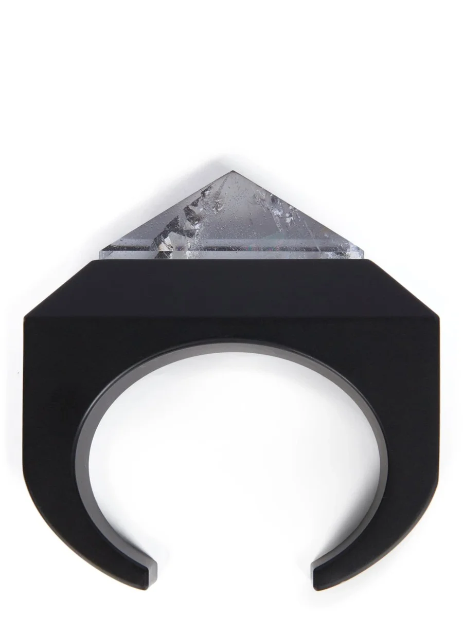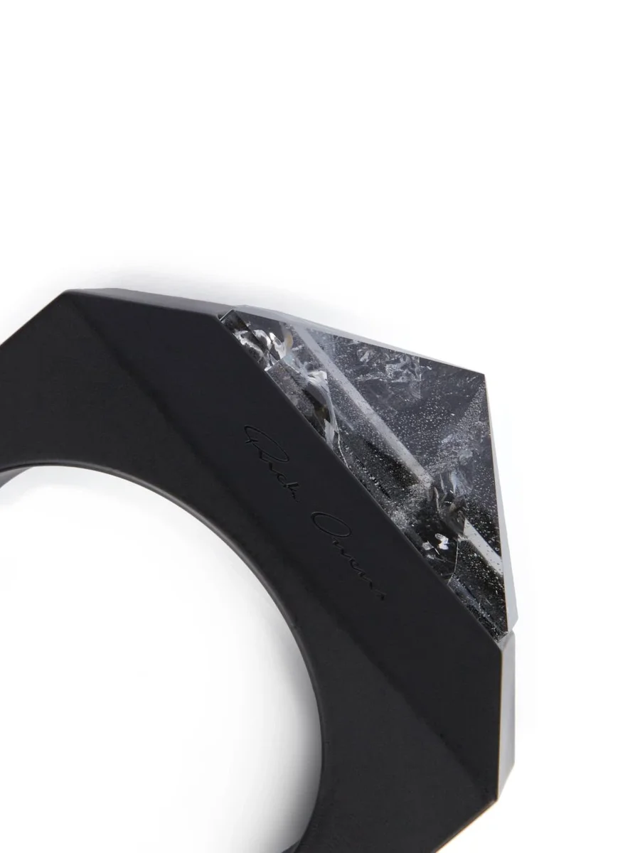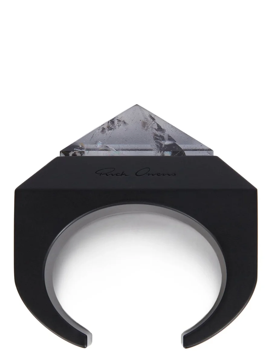 DEZE KRISTALLEN PIRAMIDE ARMBAND IS EEN GROTE, STIJVE METALEN MANCHET MET AFGESCHUINDE RANDEN. DEZE IS BESCHERMD MET EEN GROTE PIRAMIDEVORMIGE BERGKRISTAL. HET RICK OWENS LOGO IS IN DE ZIJKANT GEGRAVEERD.