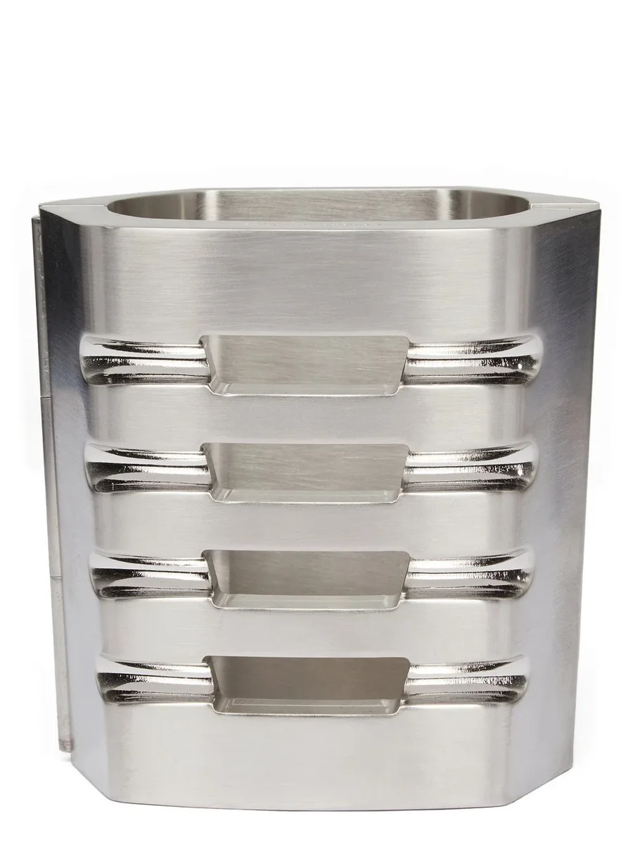 DEZE GRILL MANCHET IS EEN HARDE METALEN ARMBAND MET GRILL-OPENINGEN EN EEN MAGNETENSLUITING. HET RICK OWENS LOGO IS GEGRAVEERD OP DE BOVENKANT. DEZE SIERADEN ZIJN VERVAARDIGD MET HET INDIVIDUELE HANDWERK VAN DE AMBACHTSMAN, WAARDOOR ELK ARTIKEL UNIEK IS.