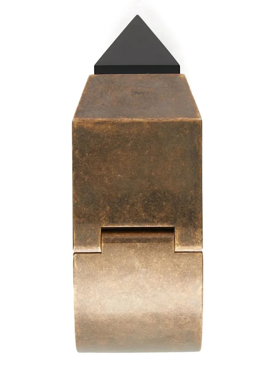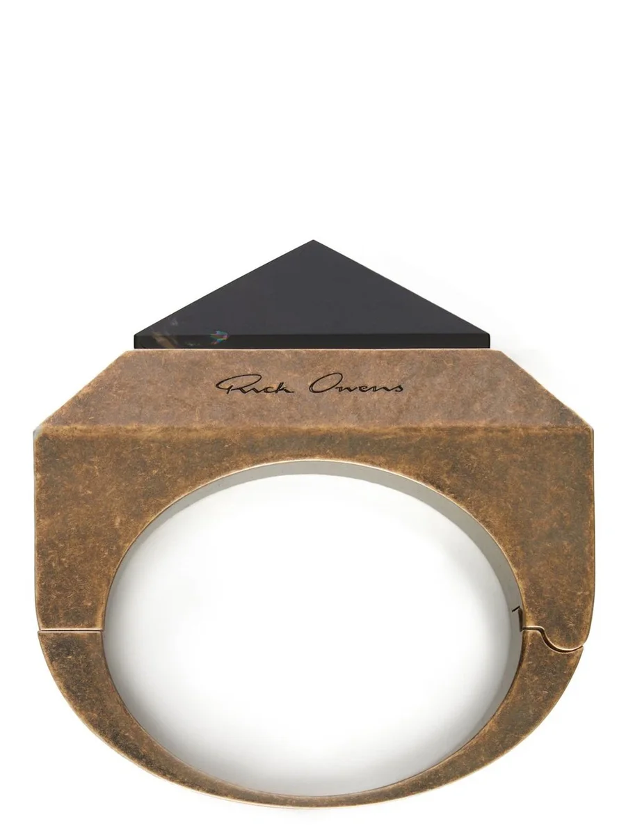 DEZE KRISTALLEN PIRAMIDE ARMBAND IS EEN MASSIEF METALEN MANCHET MET AFGESCHUINDE RANDEN, BEDOELD MET EEN GROTE PIRAMIDEVORMIGE BERGKRISTALSTEEN. DEZE HEEFT EEN MAGNETISCHE SLUITING AAN DE ZIJKANT EN HET RICK OWENS LOGO IS IN DE ZIJKANT GEGRAVEERD.