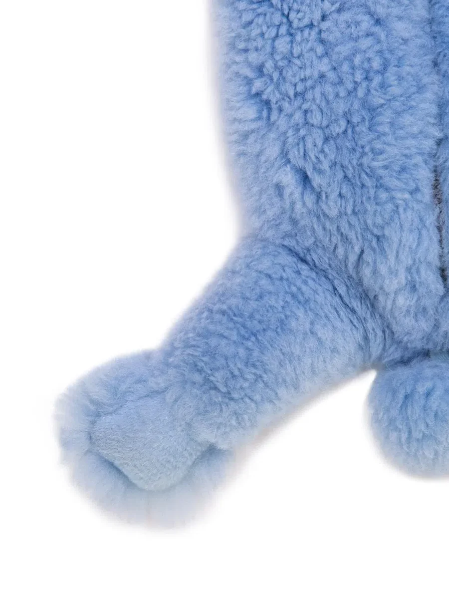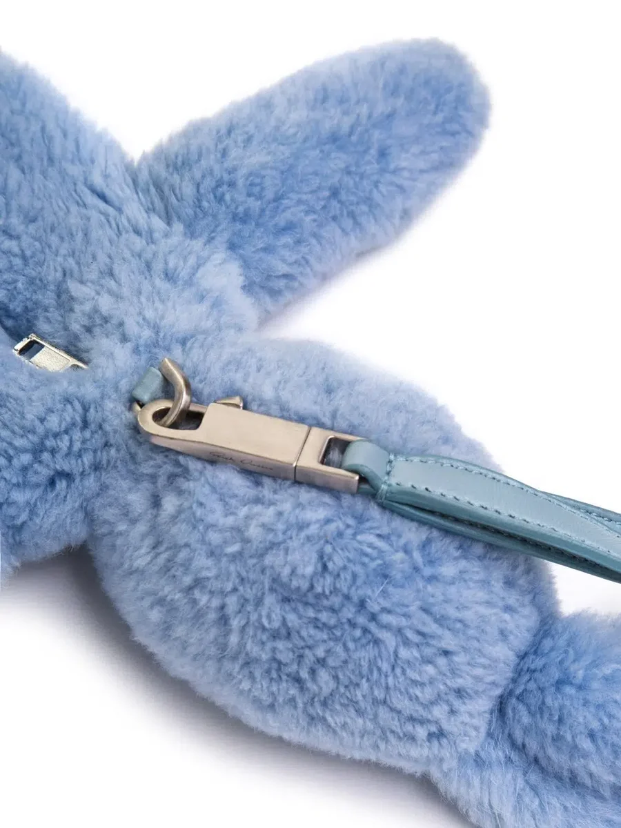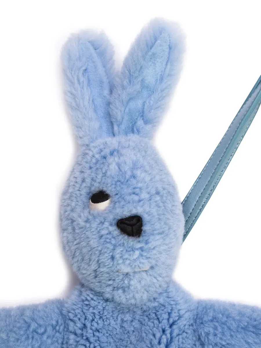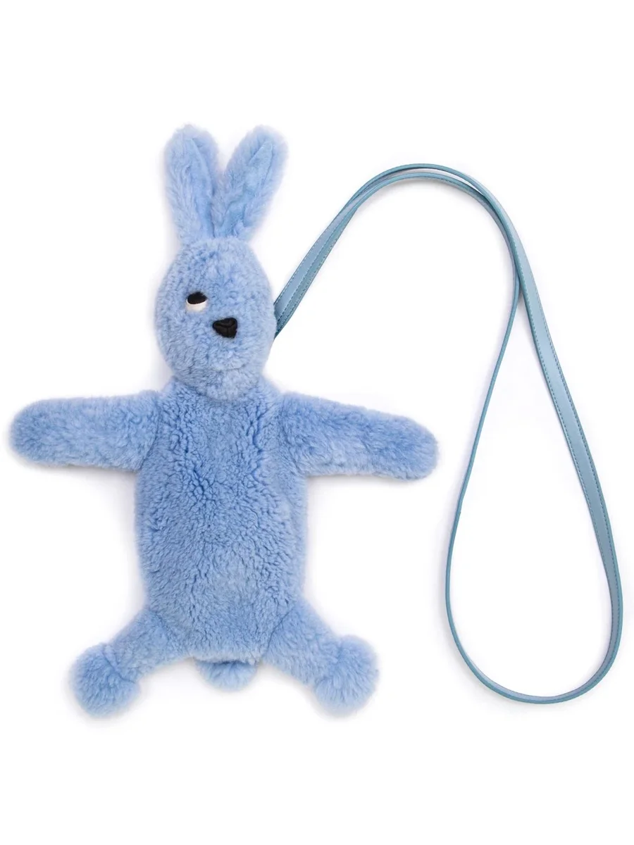 RICK OWENS HUN FAT BUNNY IN POEDERBLAUW HEEFT EEN NUTRIA-VACHT, ÉÉN OOG, ÉÉN NEUS, TWEE TANDEN, LANGE OREN, EEN GEHEIM ZAKJE MET RITSSLUITING OP DE ACHTERKANT EN EEN AFNEEMBARE DUNNE SCHOUDERBAND. OOK EEN KLEINE TAS.