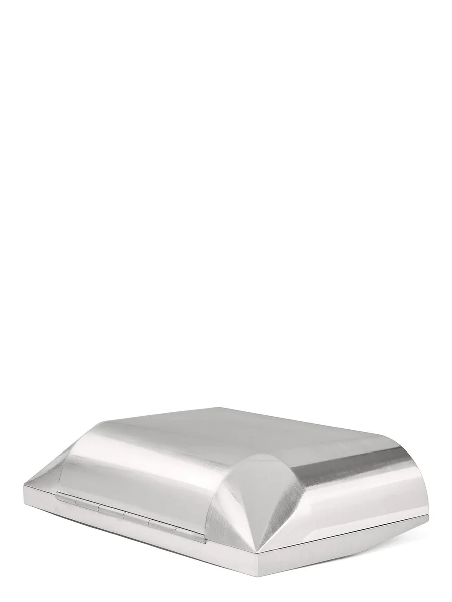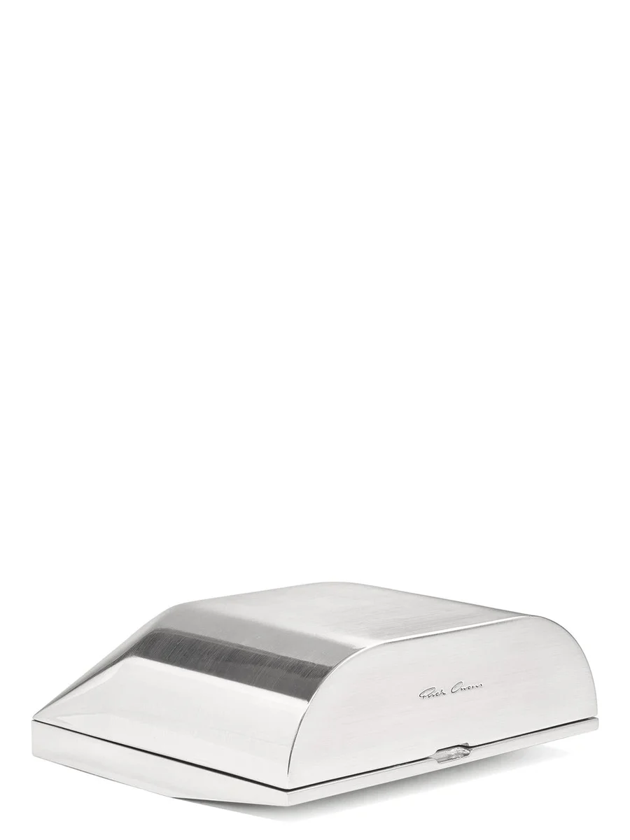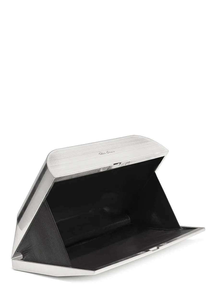 DEZE GROTE CLUTCH MET TANDEN IS EEN HARDE METALEN TAS MET EEN PLATTE BODEM EN EEN AFGERONDE VORM MET AFGESCHUINDE HOEKEN. DEZE HEEFT EEN SCHARNIEROPENING EN EEN LEREN BINNENKANT. HET RICK OWENS-LOGO IS OP DE BOVENKANT GEGRAVEERD.