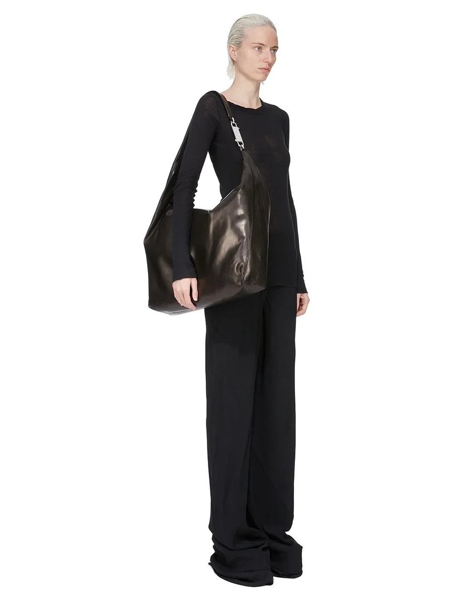 DEZE GEMINI TAS IS EEN GROTE, ZACHTE A-VORMIGE TAS DIE IN HET MIDDEN SLOFT. DEZE DRAAIT OM EEN BAND TE VORMEN DIE WORDT VASTGEZET MET EEN GEMINI DUBBELE KARABIJNHAAK MET HET RICK OWENS LOGO. DE TAS GAAT OPEN MET EEN BOVENRITS, HEEFT EEN BINNENZAK EN EEN PLATTE ZAK MET KENMERKENDE U-VORMIGE STIKDETAILS ZICHTBAAR OP DE ACHTERKANT.