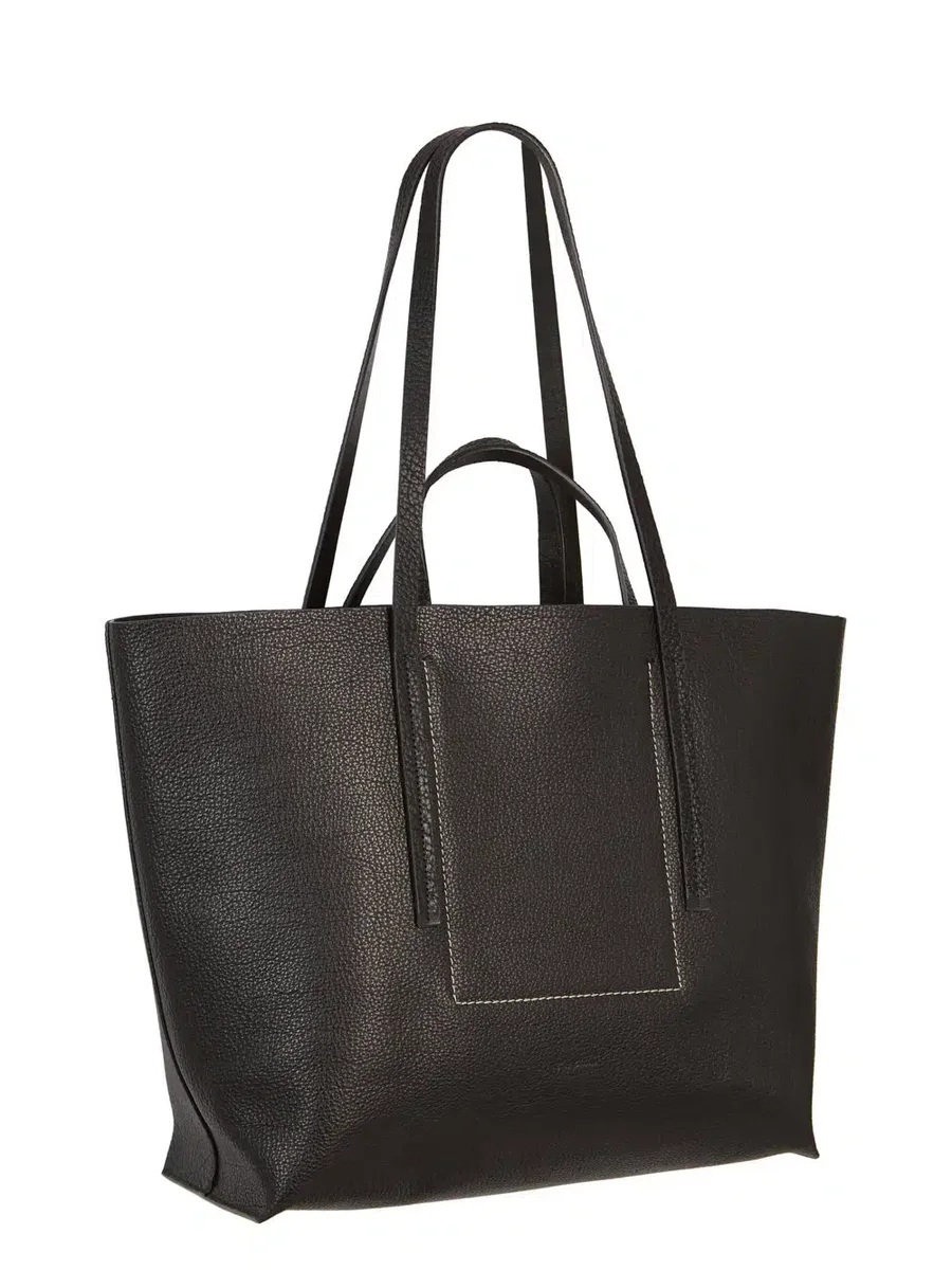DEZE SHOPPER IS EEN HORIZONTALE RECHTHOEKIGE TOTE BAG MET EEN OPEN BOVENKANT. ZE HEEFT TWEE LANGE HANDGREPEN DIE BEDOELD ZIJN OM OVER DE SCHOUDER TE DRAGEN EN TWEE KORTE HANDGREPEN. DEZE HEEFT EEN BINNENVAK MET RITSSLUITING EN EEN PLAT BINNENVAK MET KENMERKENDE U-VORMIGE STIKSELS DIE ZICHTBAAR ZIJN OP DE VOORKANT. HET IS BEDRUKT MET HET RICK OWENS LOGO.