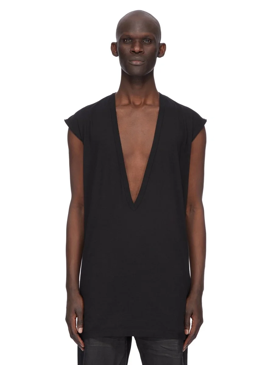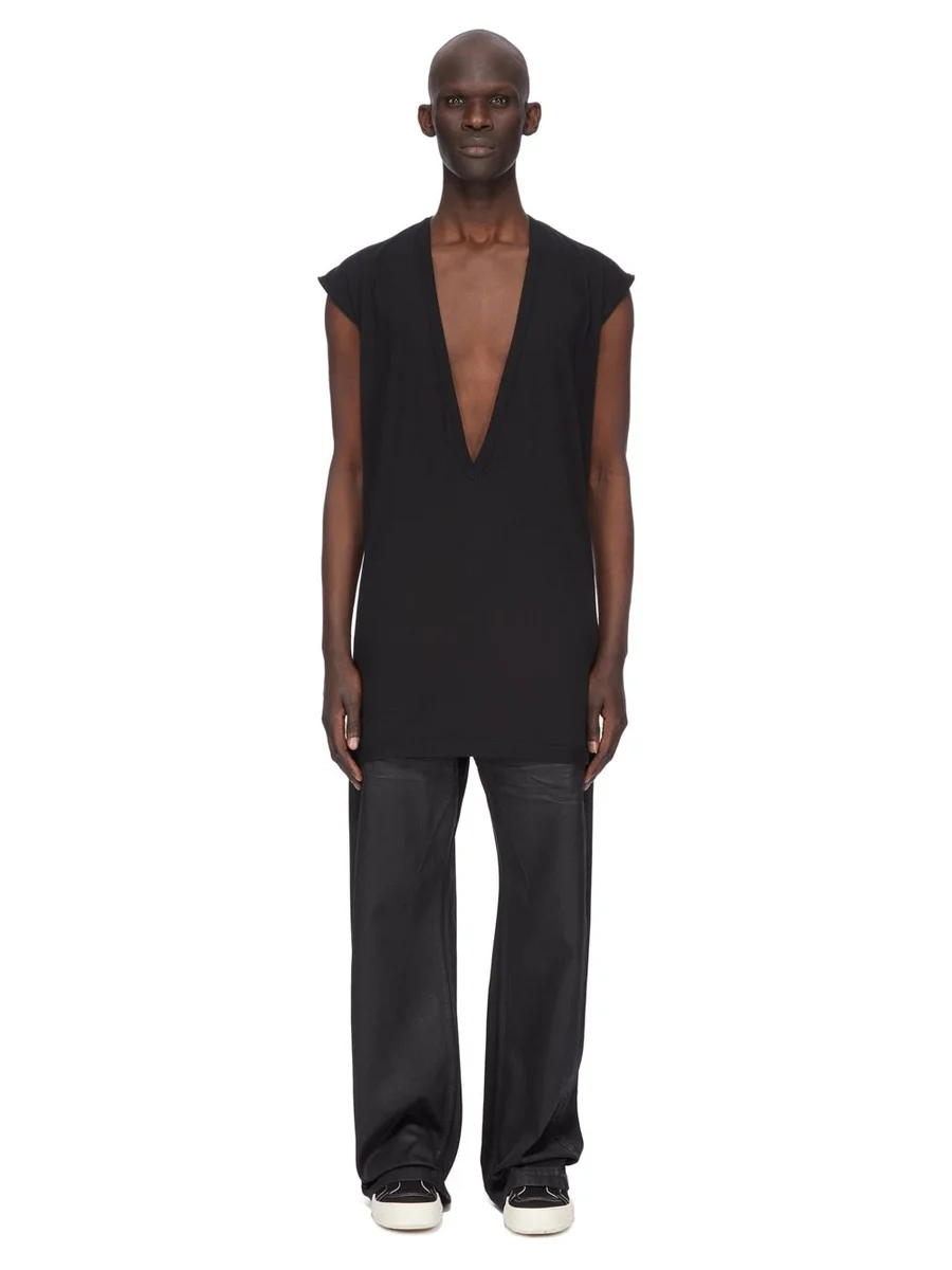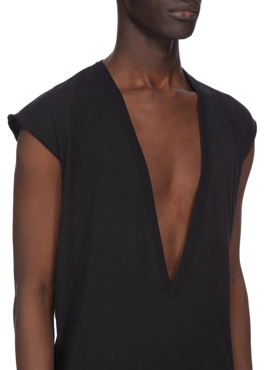 Dit DYLAN T-shirt valt onder de heupen en heeft een extreem diepe V-hals met brede tankvormige schouders en verstevigde, ruw gesneden armsgaten. Het shirt heeft de kenmerkende enkele naad die over het midden van de rug loopt.