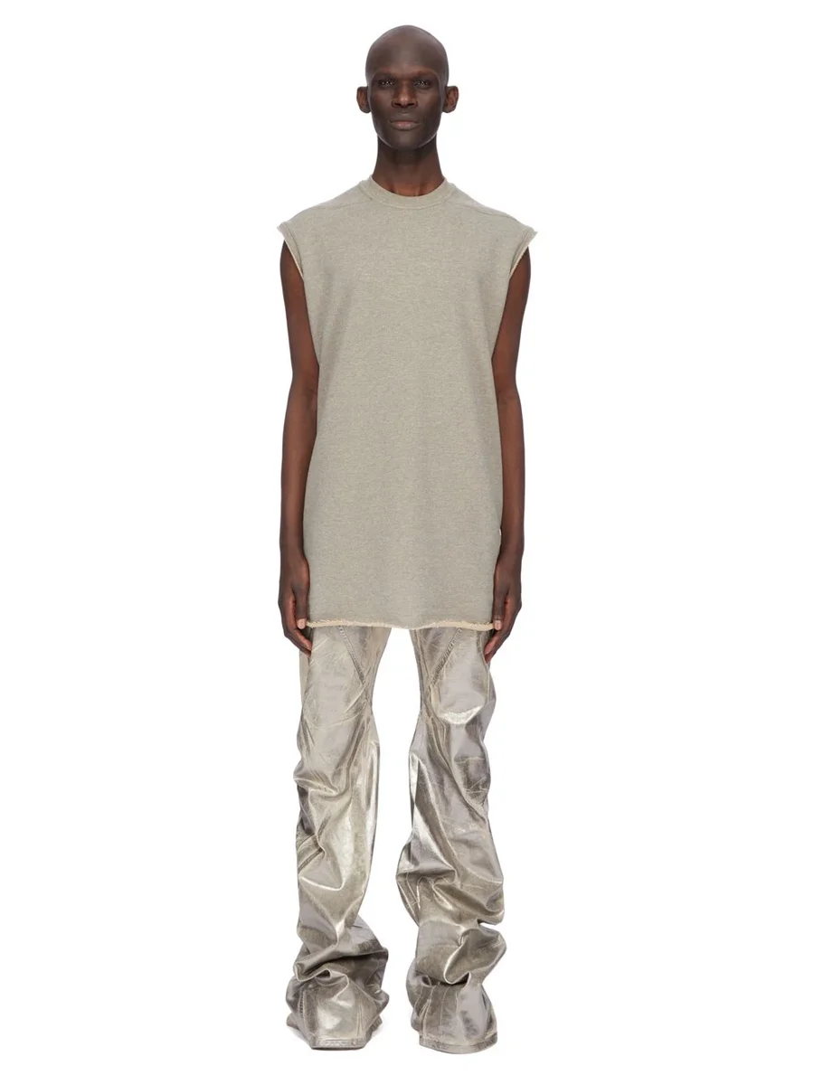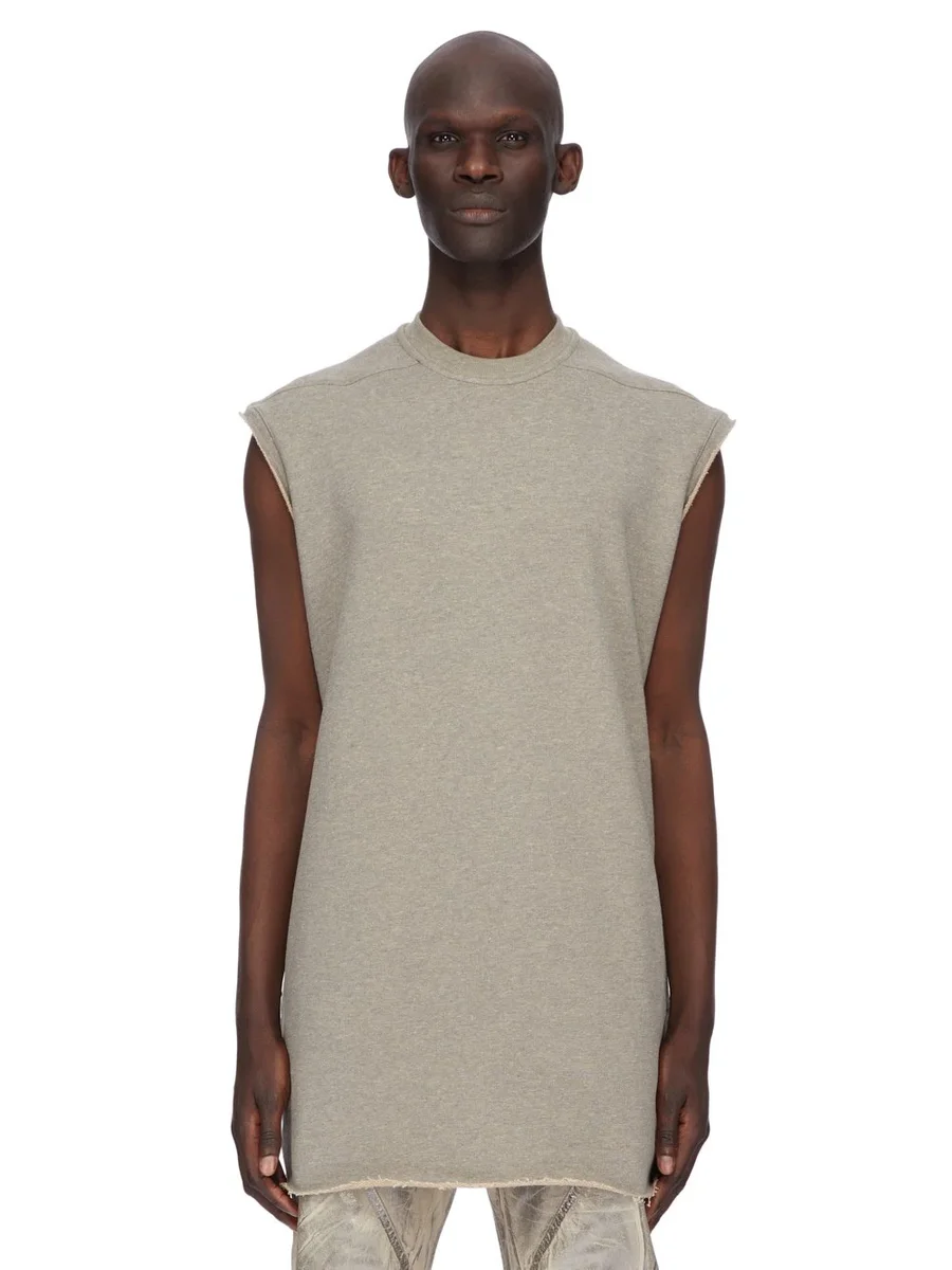 DIT TARP T-SHIRT IS LENGTE TOT ONDER DE HEUP EN HEEFT EEN LOSSE PASVORM. MOUWLOOS, MET BREDE SCHOUDERS EN EEN GERIBBDE RONDE HALS. HET HEEFT KENMERKENDE SCHOUDERNADEN AAN DE VOORKANT EN EEN ENKELE NAAD DIE LOOPT OVER HET MIDDEN VAN DE ACHTERKANT.
