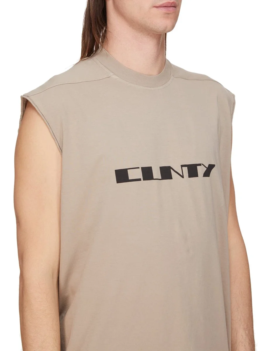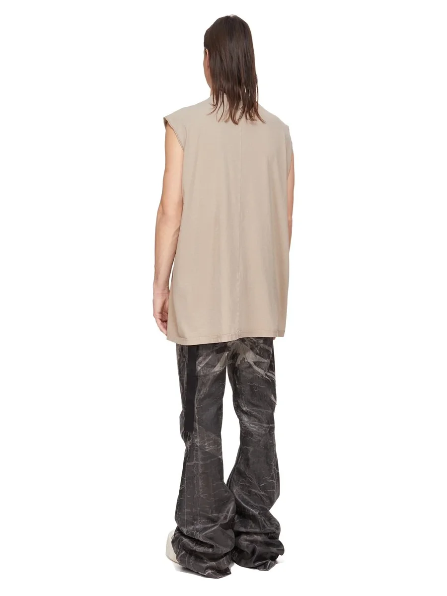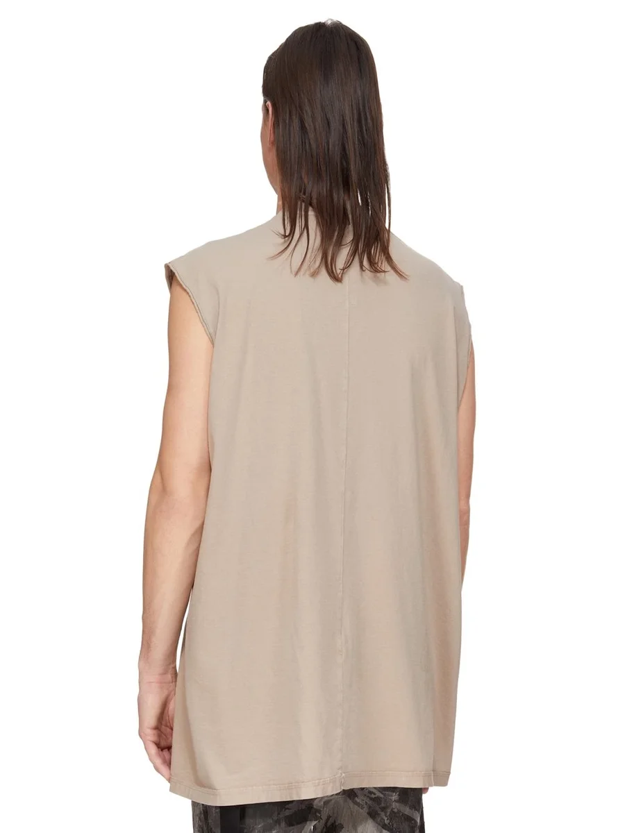 DIT TARP T-SHIRT IS LANG TOT ONDER DE HEUP EN HEEFT EEN LOSSE PASVORM. HET IS MOUWLOOS, HEEFT BREDE SCHOUDERS EN EEN GERIBBDE RONDE HALS. HET HEEFT KENMERKENDE SCHOUDERNADEN AAN DE VOORKANT EN EEN ENKELE NAAD DIE OVER HET MIDDEN VAN DE ACHTERKANT LOOPT.