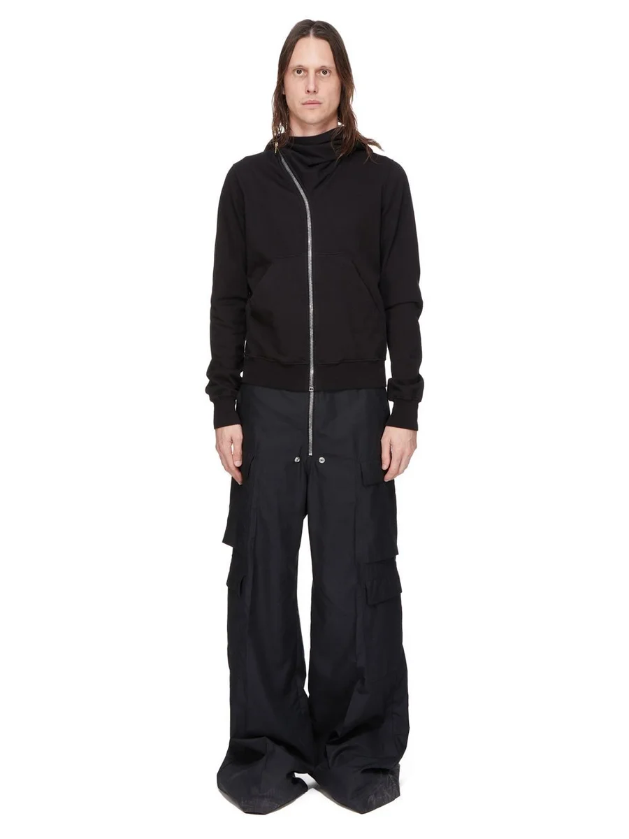 DEZE MOUNTAIN HOODIE IS BOVEN DE HEUP EN HEEFT LANGE MOUWEN. HIJ HEEFT EEN GEBOGEN ASYMMETRISCHE RITSSLUITING, EEN KLEINE OPSTAPKRAAG EN EEN GROTE, PUNTIGE CAPUCHON. HIJ HEEFT TWEE OPGEPASTTE VOORZAKKEN, GERIBBDE MANCHETTEN EN EEN KENMERKENDE ENKELE NAAD IN DE TAILLEBAND DIE OVER DE MIDDENACHTERKANT LOOPT.