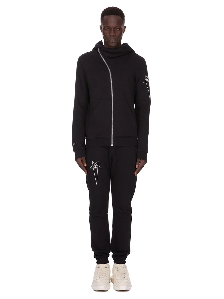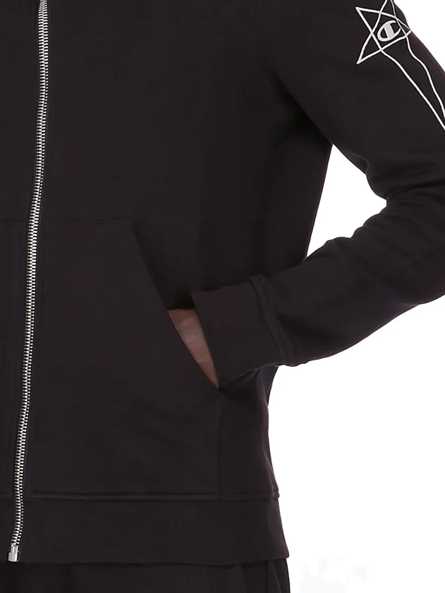 HET HEEFT EEN 3D GEBORDUURD CHAMPION X RICK OWENS PENTAGRAM LOGO OP DE LINKERBOVENARM EN EEN CHAMPION LOGO OP DE RECHTERPOLS.