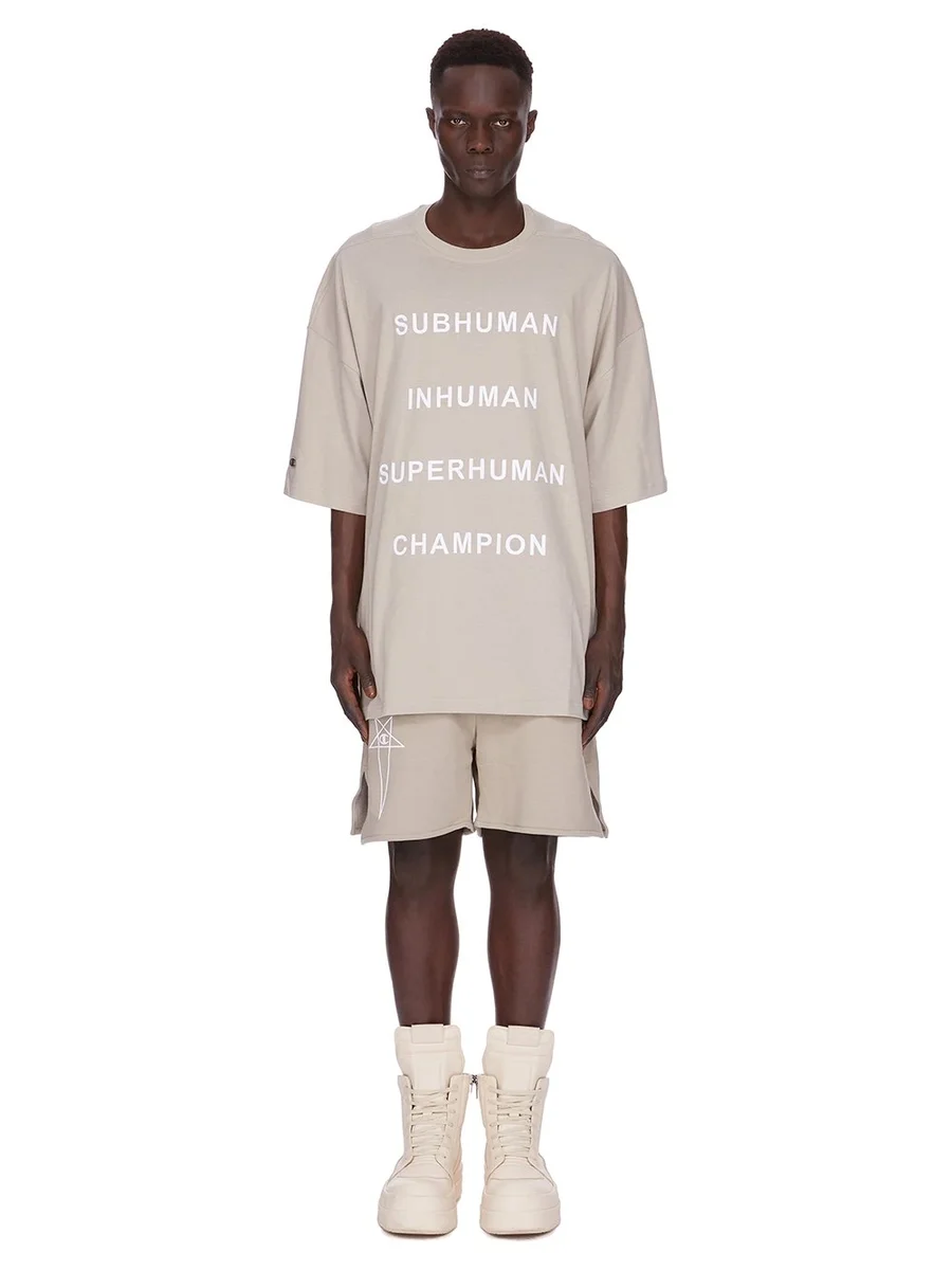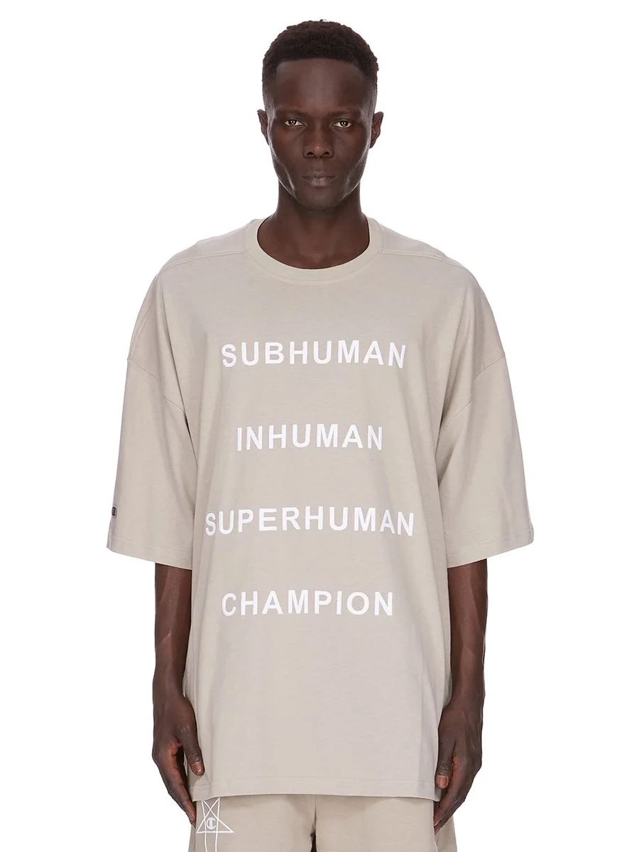 HET HEEFT EEN 3D GEBORDUURD CHAMPION X RICK OWENS SUBHUMAN, INHUMAN, SUPERHUMAN, CHAMPION-LOGO OP DE VOORKANT EN EEN CHAMPION-LOGO OP DE RECHTERMOUW.