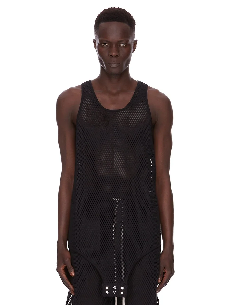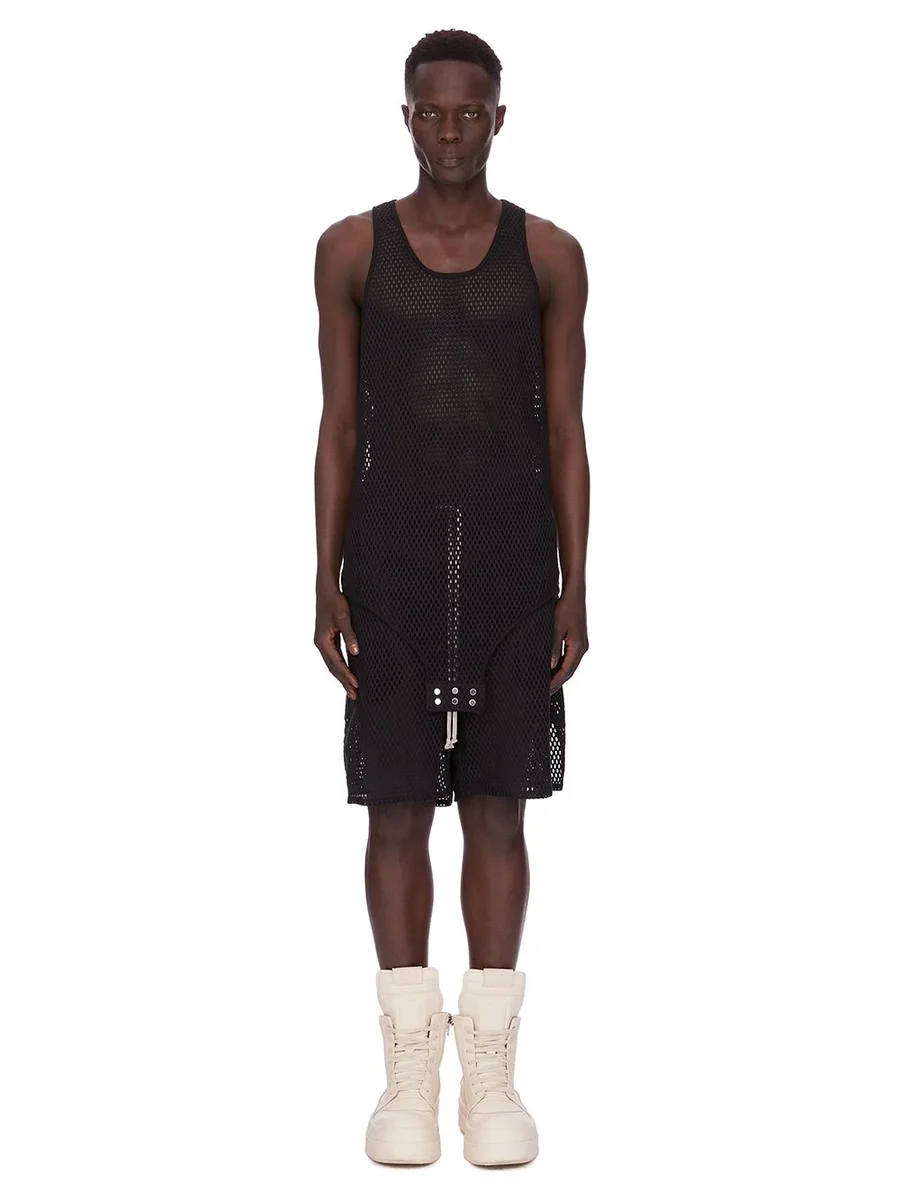 CHAMPION X RICK OWENS SS25 BASKETBAL T-SHIRT IN ZWART OPEN MESH JERSEY