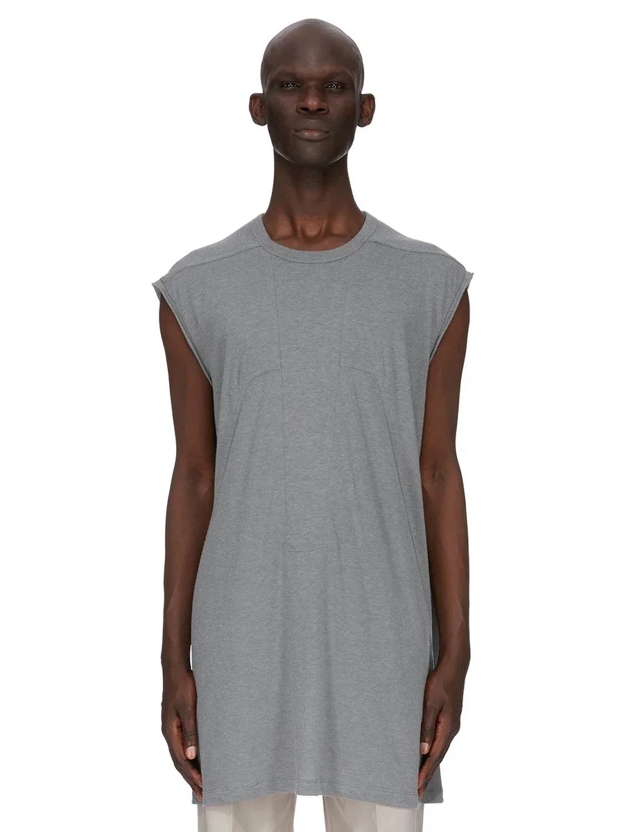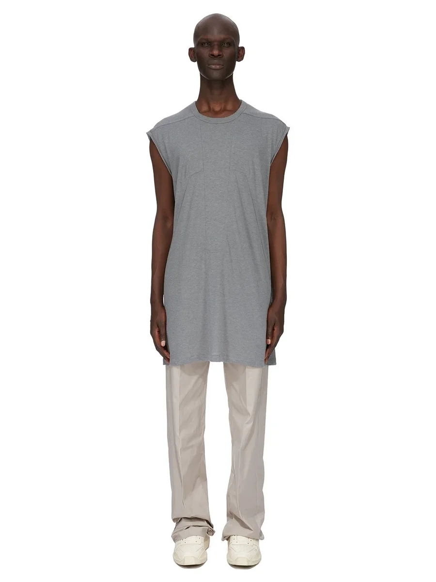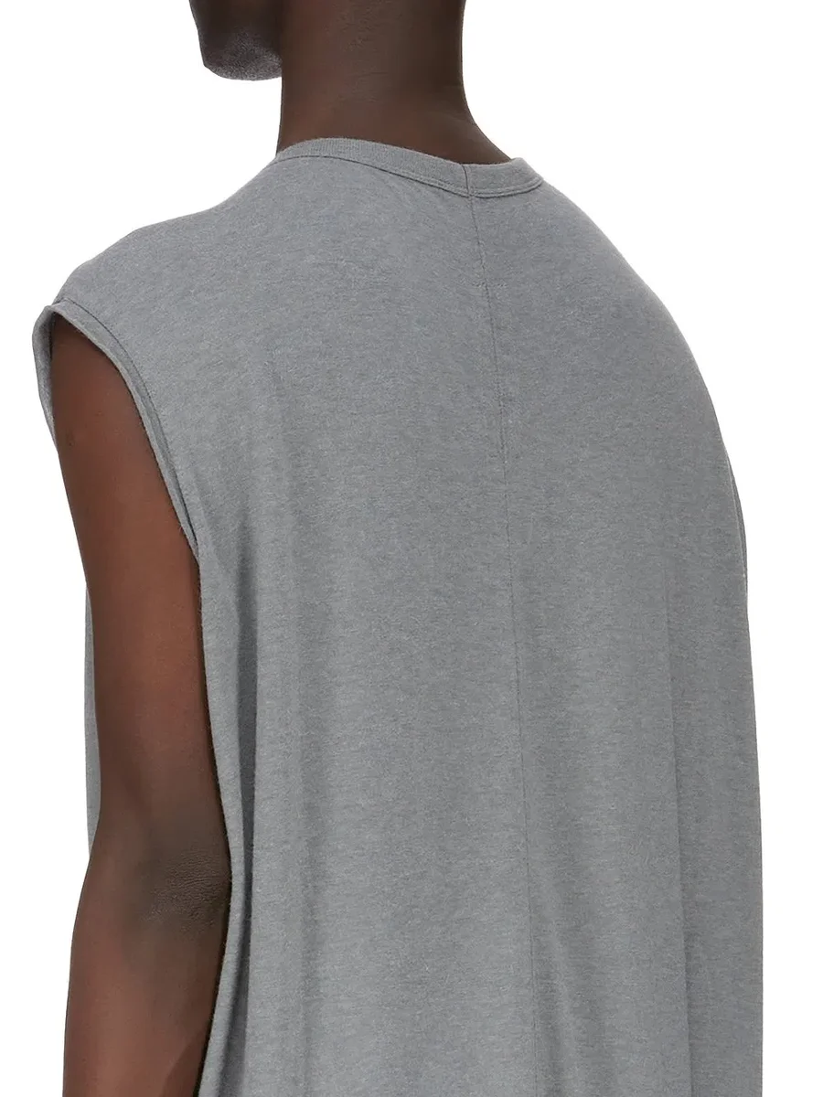 DIT TARP T-SHIRT IS LANGS DE HEUP EN HEEFT EEN LOSSE PASVORM. HET IS MOUWLOOS, HEEFT BREDE SCHOUDERS EN EEN GERIBBDE RONDE HALS. HET HEEFT KENMERKENDE SCHOUDERNADEN AAN DE VOORKANT EN EEN ENKELE NAAD DIE OVER HET MIDDEN VAN DE ACHTERKANT LOOPT.