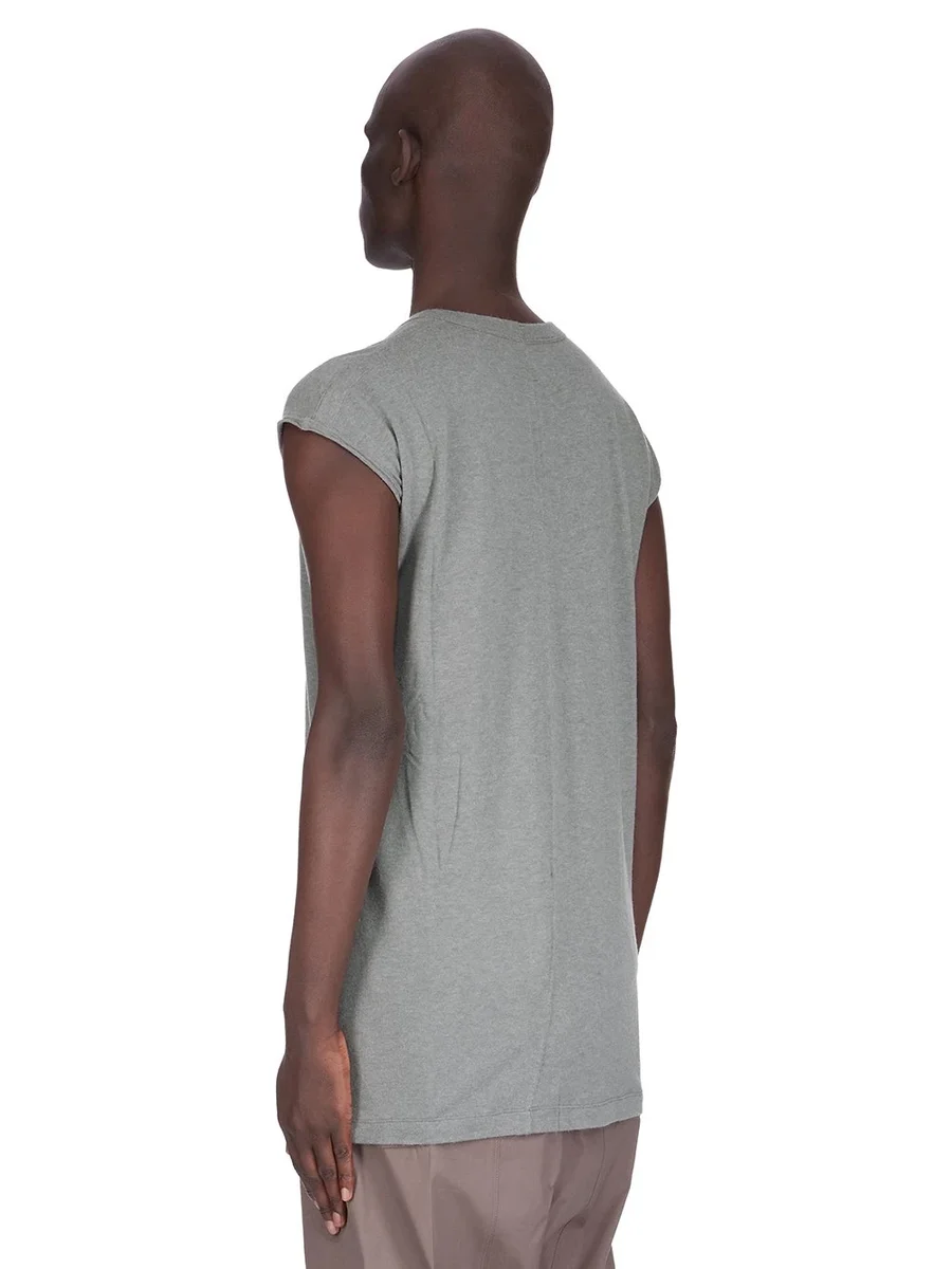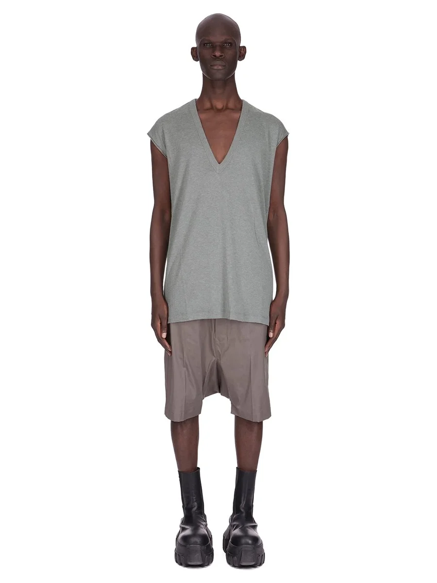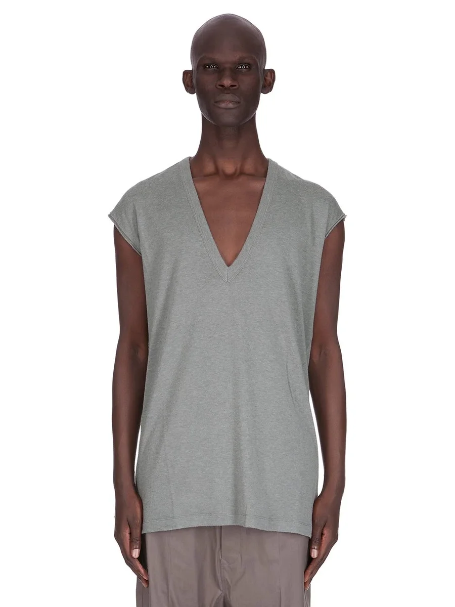 Dit shirt met diepe V-hals valt tot op de heup en heeft een diepe V-hals met brede tankvormige schouders en versterkte, ruwe mouwen. Het heeft de kenmerkende enkele naad die over het midden van de rug loopt.