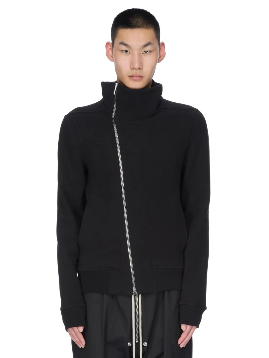 DEZE BAUHAUS JOGGINGBROEK IS HEUPLENGTE MET LANGE MOUWEN. HIJ HEEFT EEN LICHT ASYMMETRISCHE, UIT HET MIDDEN GEZETTE RITSSLUITING DIE VAN DE MIDDENZOOM TOT DE RECHTERWANG LOOPT. MET DE RITSSLUITING HEEFT HIJ EEN OPSTAANDE HALS DIE, OPEN GERITST, EEN BREDE GEDRAPEERDE KRAAG WORDT. HET HEEFT ZIJZAKKEN, GLADDE SCHOUDERNADEN, GERIBBDE MANCHETTEN EN TAILLEBAND, DIE AAN DE ACHTERKANT BREDER IS.