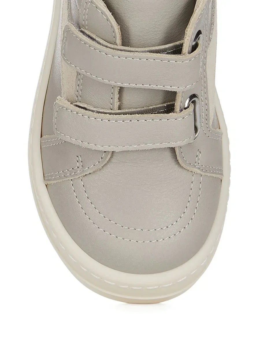 DEZE VINTAGE SNEAKS VOOR KINDEREN ZIJN ONDER DE ENKEL HOOG, HEBBEN TWEE KLITTENBANDJES EN EEN ZOOL MET HAAIENTANDEN. ZE ZIJN VOORZIEN VAN EEN GRAFISCHE LEDEREN APPLIQUE OP DE ZIJVOET EN CONTRASTERENDE STIKSELS.