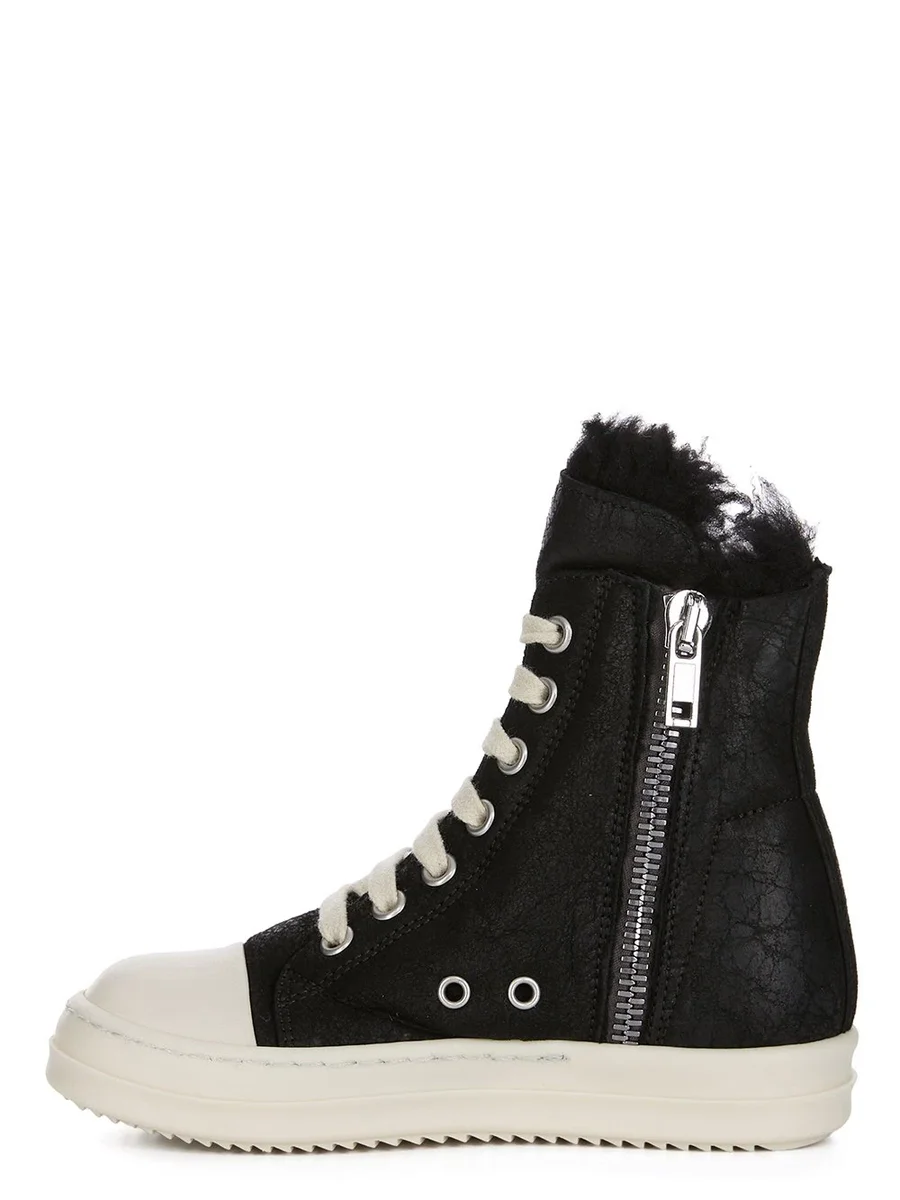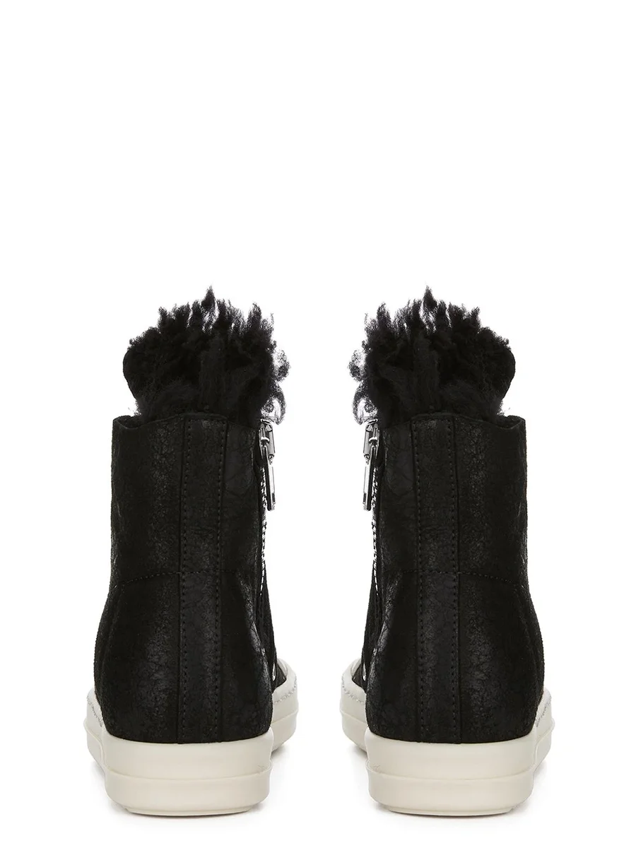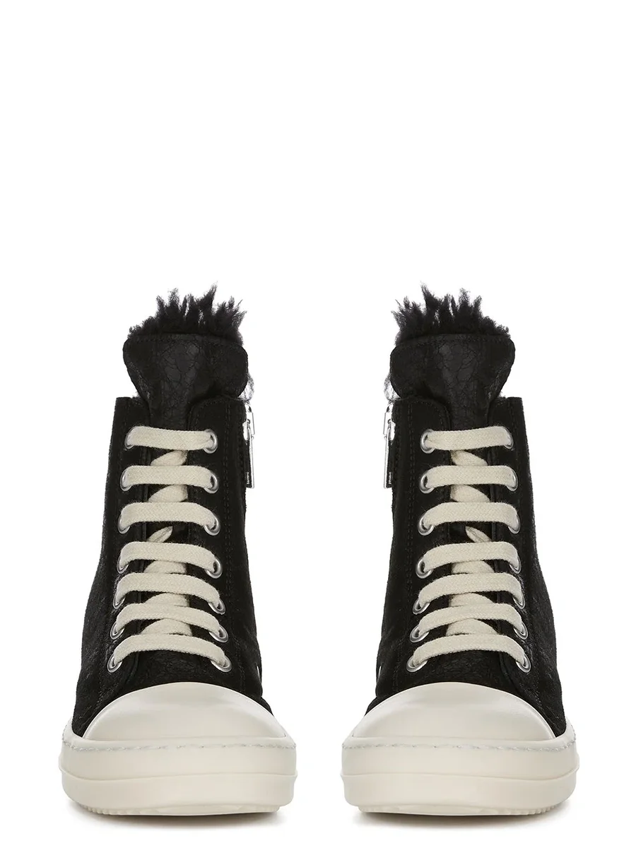 RICK OWENS FW25 CONCORDIANS SHEARLING SNEAKERS IN ZWART/MELK/MELK CURLY SHEARLING