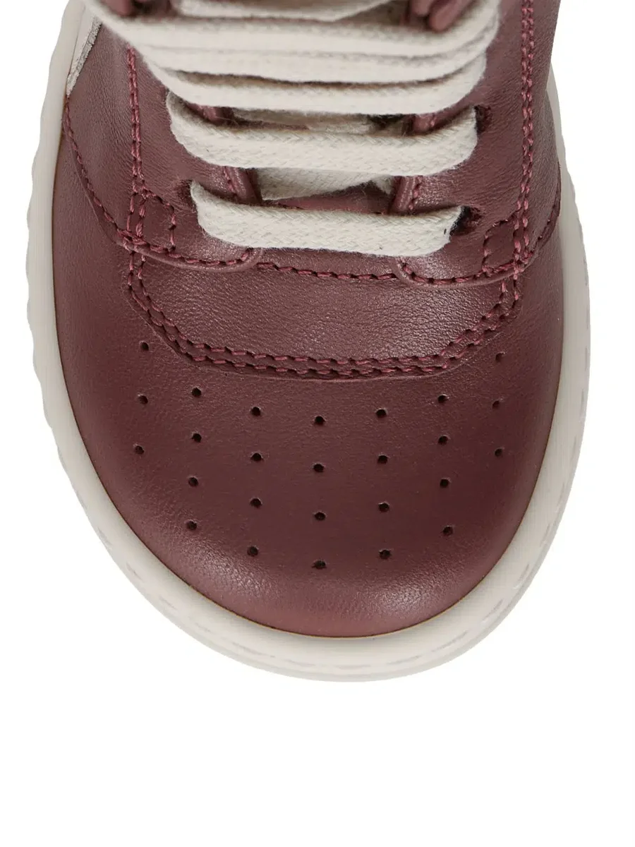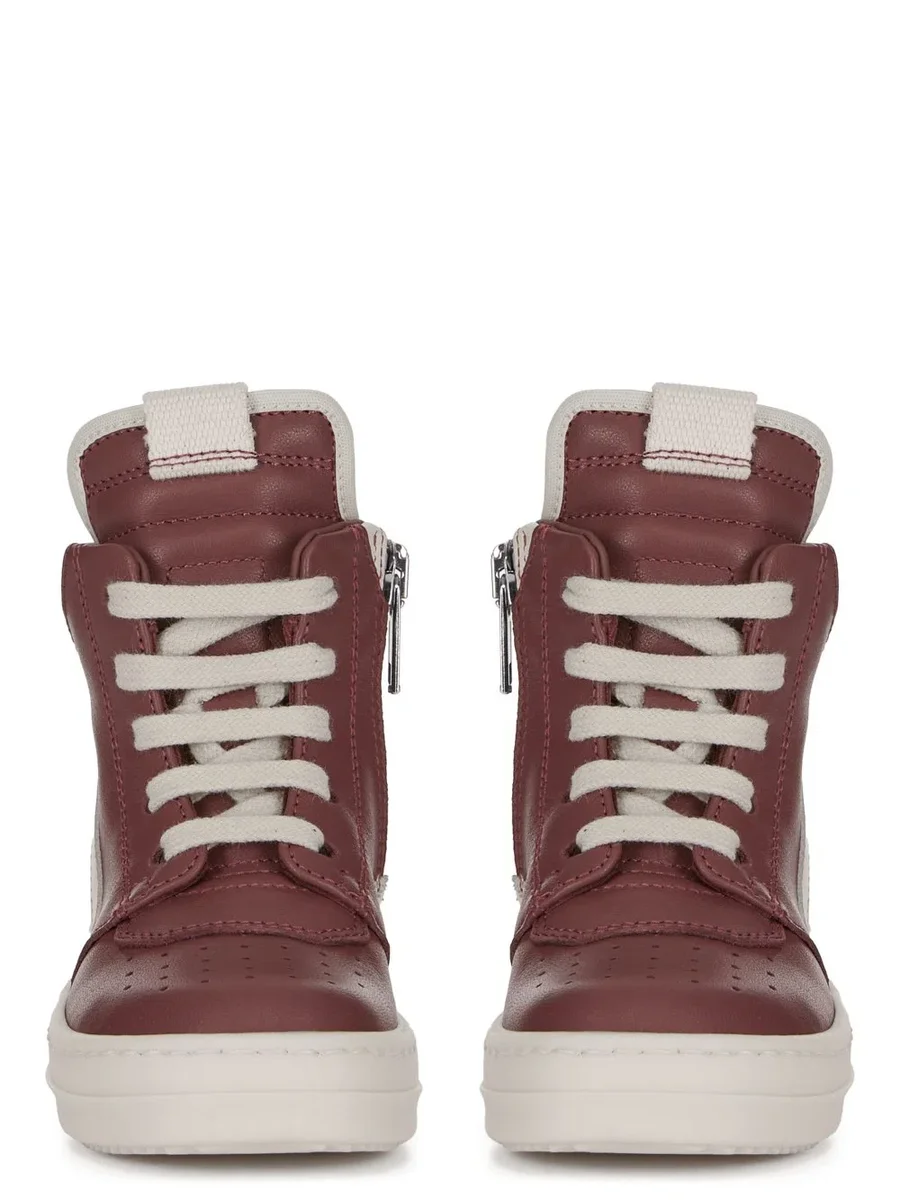 DEZE BABYGEO’S HEBBEN DE KENMERKENDE RICK OWENS GEOBASKET-VORM AANGESCHAFT VOOR BABY’S EN ZIJN GEMAAKT VOOR DE EERSTE STAPJES. ZE HEBBEN VETERS, EEN ZIJRITS VOOR EENVOUDIG SLUITEN EN GEOMETRISCHE NADEN MET ZICHTBARE STIKSELS EN HAAIENTANDZOLEN.